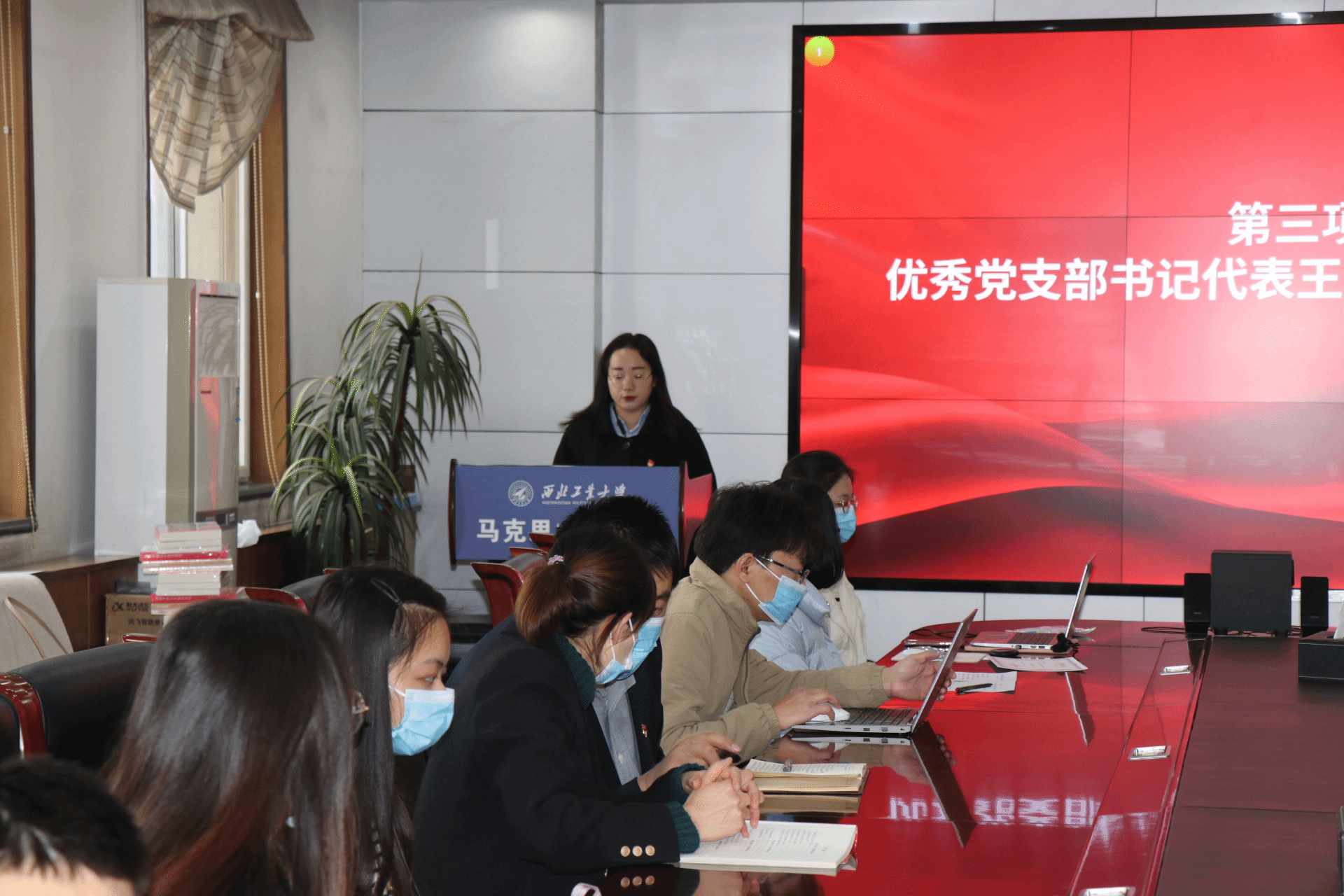 硕士生辅导员王换为学生党支部委员会成员代表颁发了党史书籍,鼓励学生支委带动全体学生要用好这些红色资源,组织广大党员重点学习党史,同时学习新中国史、改革开放史、社会主义发展史,做到学史明理、学史增信、学史崇德、学史力行,做到学党史、悟思想、办实事、开新局。