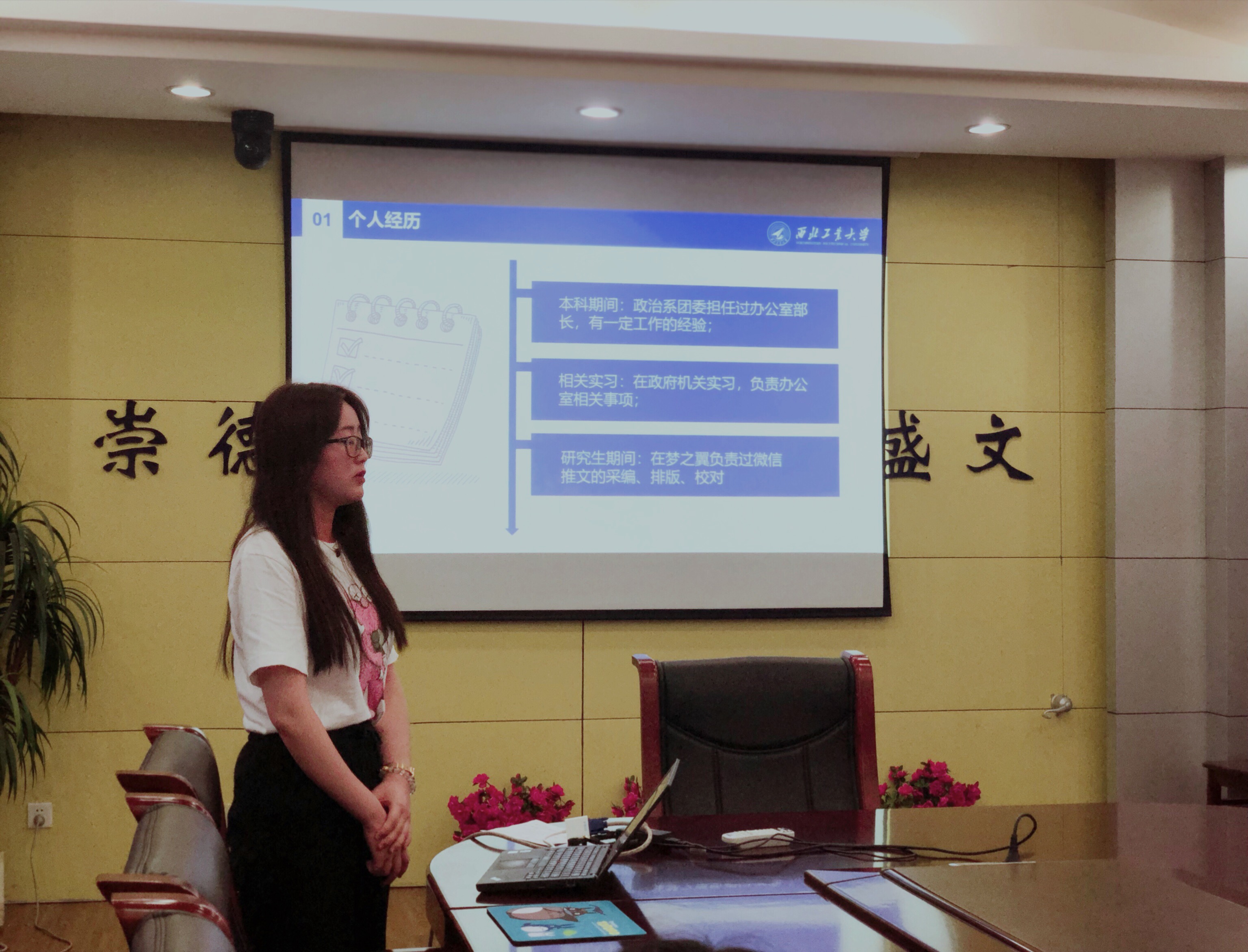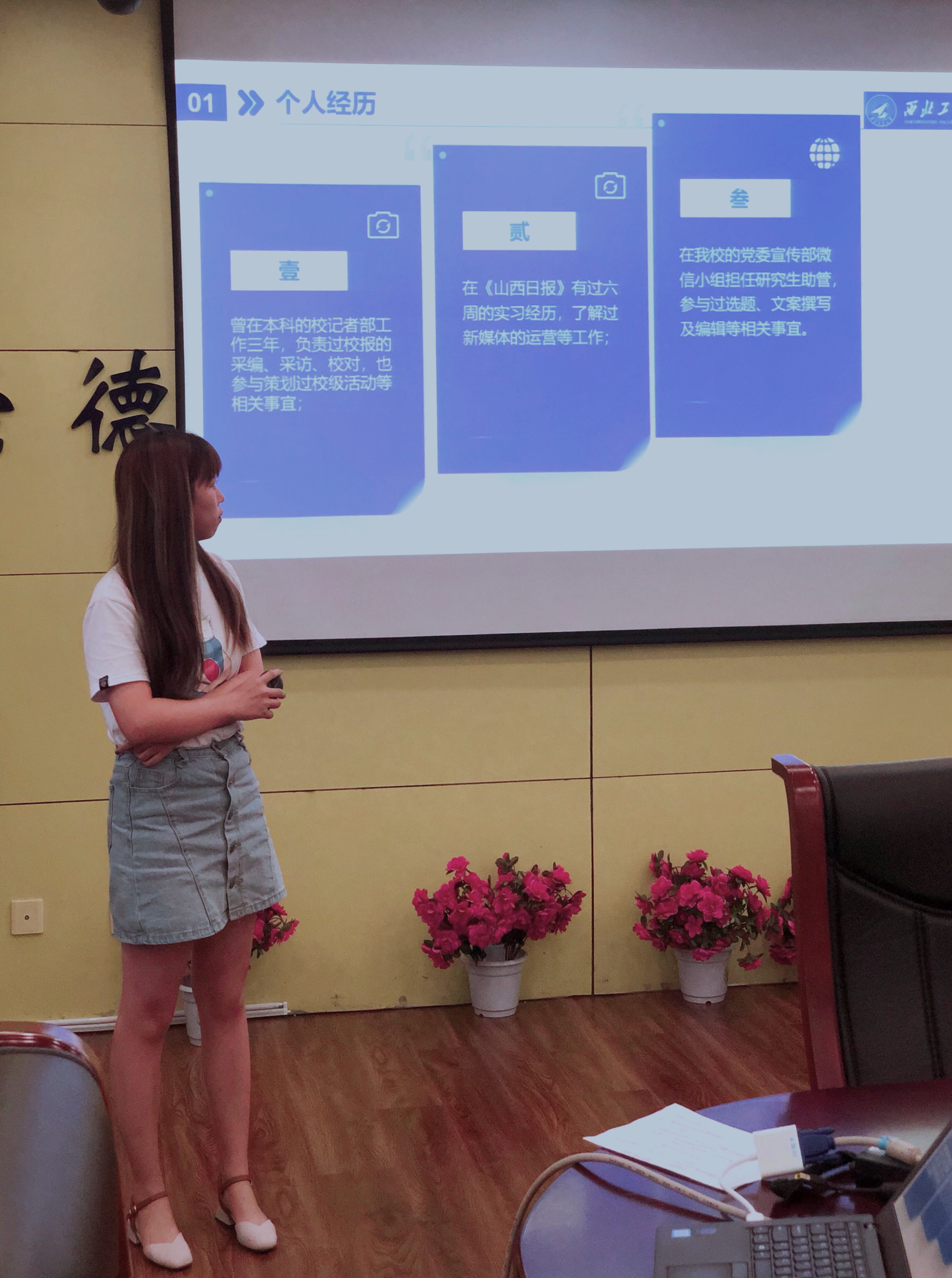 呼哲青在答辩中就宣传部的定位提出了自己的想法,宣传是研会的一个窗口,对内要做好活动的总结和宣传,提高同学们的归属感;对外要展示马院独特的风采,让全校的师生更好的认识马院。同时指出在下一年要配合好各部门的工作,提高宣传力度。