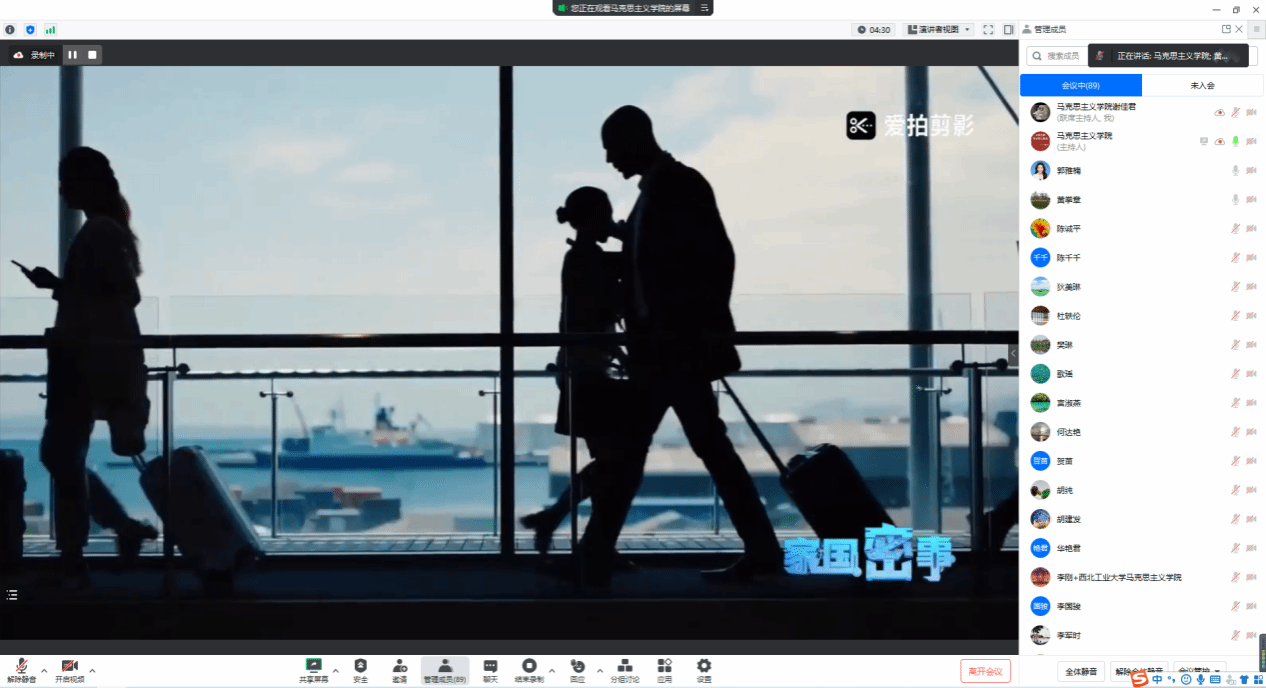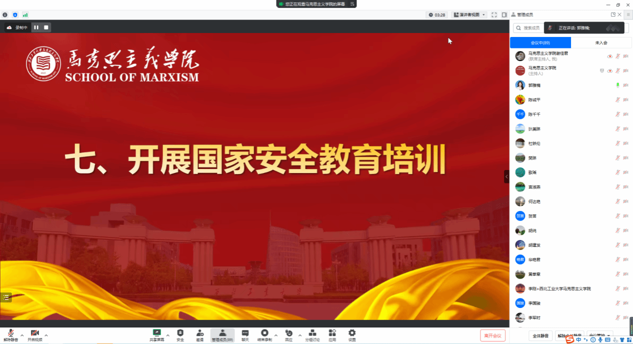 学院办公室主任郭雅楠做国家安全教育培训,传达了今年国家安全教育的主题“贯彻总体国家安全观,增强全民国家安全意识和素养,夯实以新安全格局保障新发展格局的社会基础”,并组织与会人员共同观看安全教育短片《家国密事》等。
