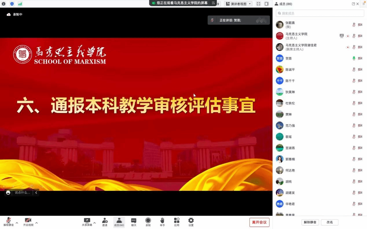 学院副院长贺苗通报了本科教学审核评估的相关事宜。她表示,前期学院已提交相关审核评估的自评报告,接下来要在进一步完善自评报告基础上,进行相关的支撑材料的准备,学院将成立本科审核评估工作小组专项负责该事宜。她指出,本科教学审核评估将于今年11月正式开始,全体教职工要按照校院两级的统一安排,勠力同心,保质保量地完成本科教学审核评估工作。