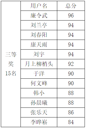 本科生、研究生在内的共921份答卷,去掉相同IP地址和超时试卷,共收回有效试卷526份。活动主办方按照知识竞赛成绩排名,共选出35名优胜者,设置一等奖10名,二等奖10名,三等奖15名。为增加竞赛的趣味性,主办方还邀请小说h