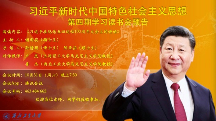于2020年10月31日晚7:30举办了习近平新时代中国特色社会主义思想学习读书会第四期交流活动,本次读书会主题主要围绕《习近平在纪念五四运动100周年大会上的讲话》进行展开。此次活动由小说h
