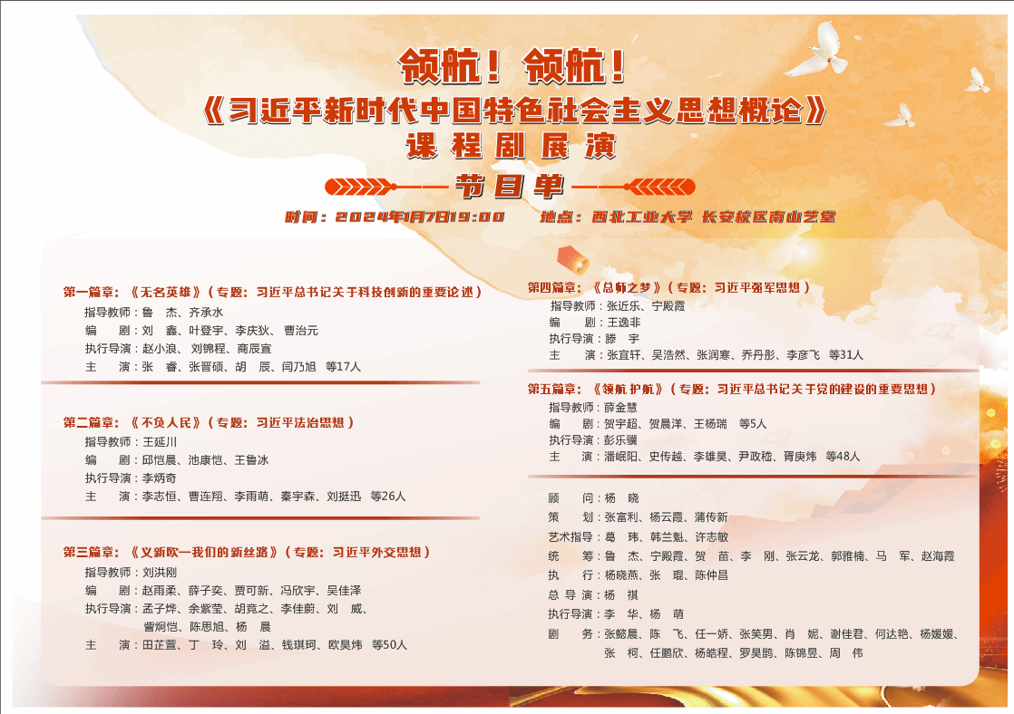 本次展演共5个子剧目,分别根据《概论》课中的“习近平总书记关于科技创新的重要论述、习近平法治思想、习近平外交思想、习近平强军思想、 习近平总书记关于党的建设的重要思想”等5个专题进行创作。小说h