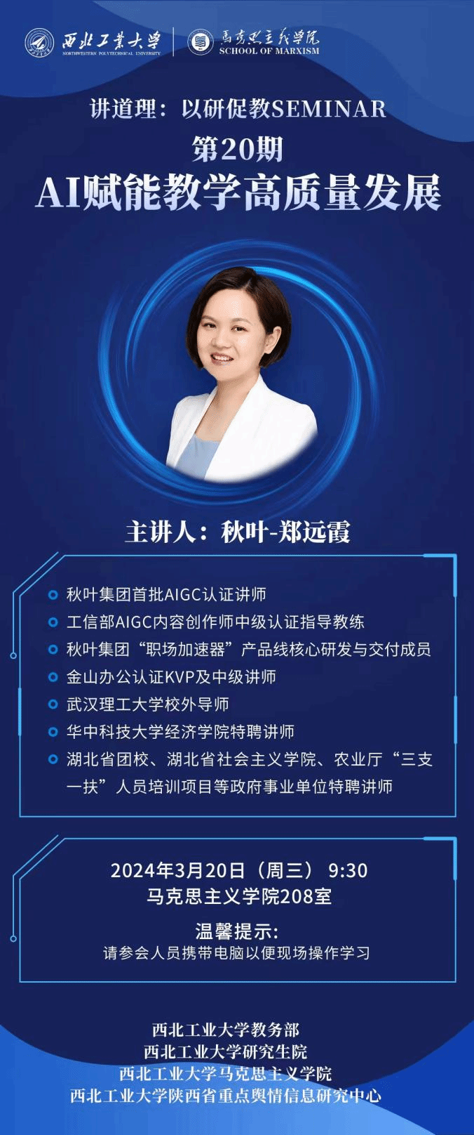 与学校陕西省重点舆情信息研究中心承办的第20期“讲道理——以研促教Seminar”成功举办,邀请了秋叶集团首批AIGC认证讲师郑远霞作关于“AI赋能教学高质量发展”的专题讲座。若干教师代表及学生代表参加讲座,讲座由副院长贺苗主持。