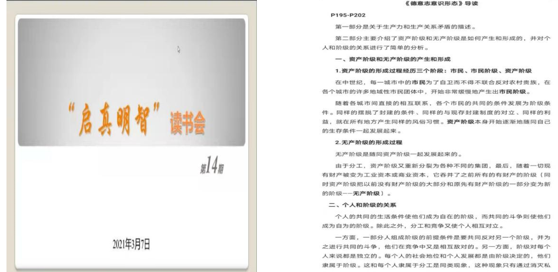 2021年3月7日,西工大“启真明智”第十五期读书会在腾讯会议线上如期举行。此次读书会由硕士生田瑞青主持,学院宁殿霞、杨荣老师以及30余位硕博生共同参加,以《德意志意识形态》第一章IV部分其中一部分作为研读篇目,展开了交流与讨论。