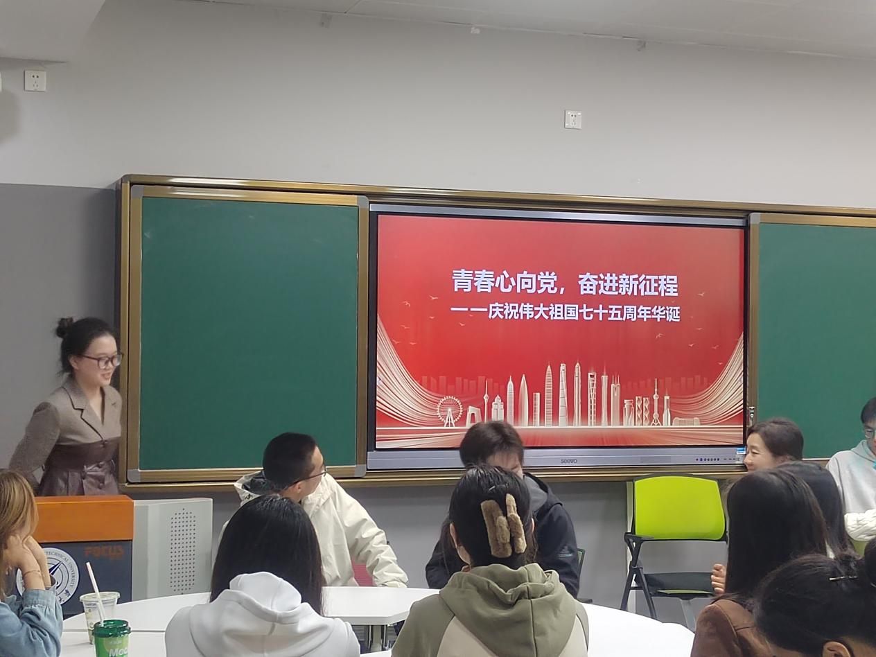 接着,大家一同观看《75年,奇迹如歌》视频,深刻感受新中国成立75年来的光辉历程和伟大成就。随后,翟文琪同学主讲了一堂生动的党课,她以《青春心向党,奋进新征程》为题,系统回顾了新中国成立以来的历史巨变,鼓励当代青年要勇于抓住机遇迎接挑战,接好接力棒,做出无愧于党和人民的好成绩。