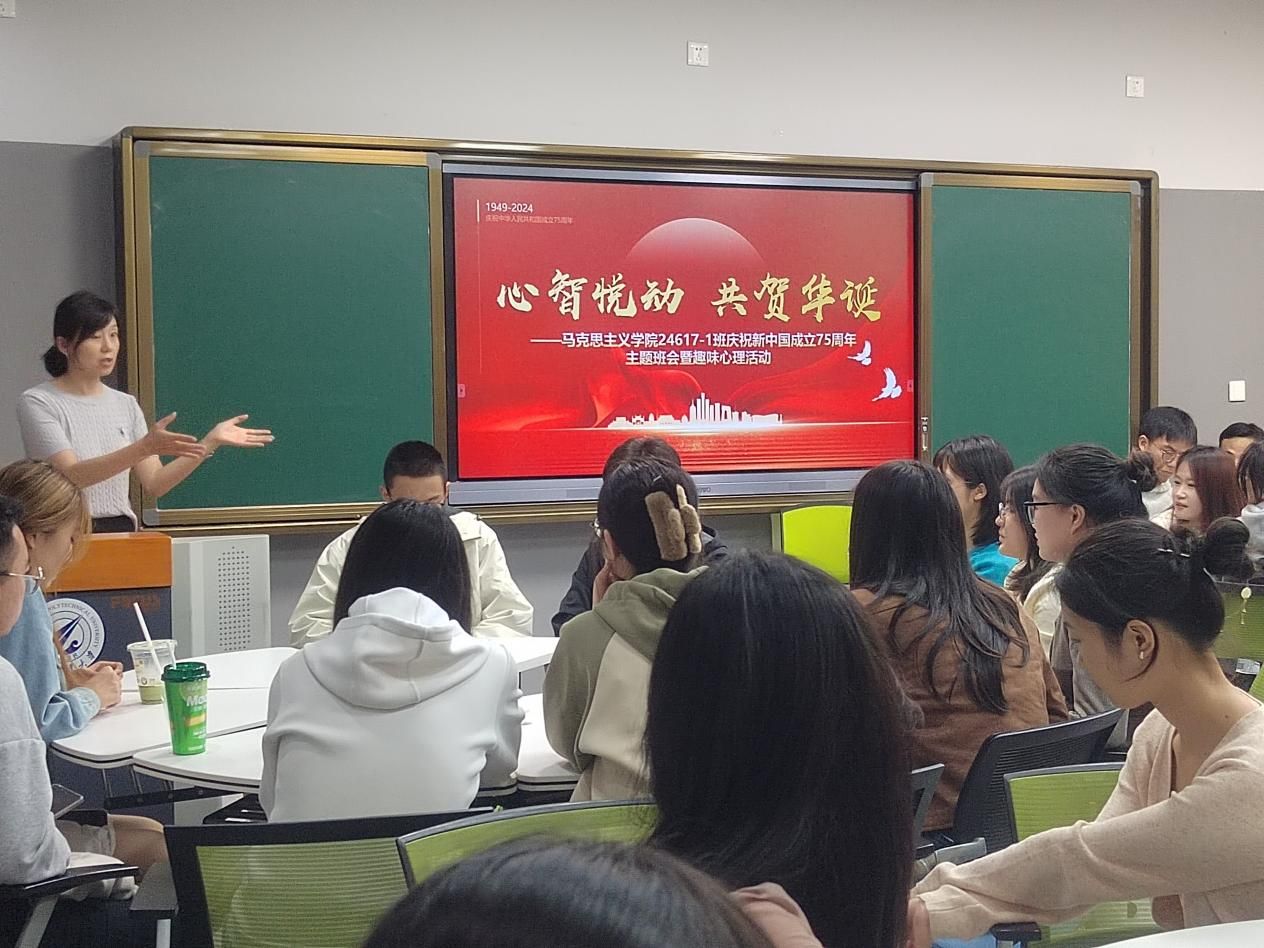 2024级硕士班在教东B2-203教室举办了“心智悦动 共贺华诞”庆祝新中国成立75周年主题班会暨趣味心理活动。本次活动由2024级硕士班班长孙抒祺主持,学院团委书记、硕士生辅导员王换受邀参加,40余名同学参加了此次活动。回首往昔,七十五年风雨兼程,中华民族在砥砺奋进中书写辉煌篇章。师生一起追溯中华大地沧桑巨变,展望中国新时代蓬勃发展,共同为祖国献上最真挚的祝福。