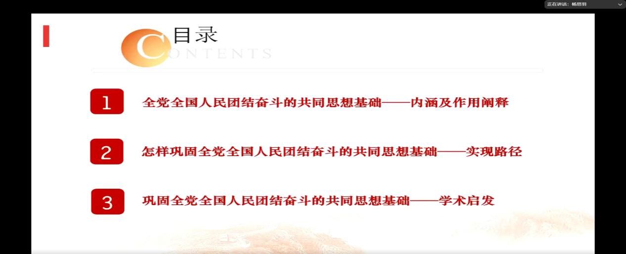 硕士生杨思羽同学作为首位导读人,紧紧围绕《怎样巩固全党全国人民团结奋斗的共同思想基础》的文本内容,从内涵与作用阐释、实现路径和学术启发三个方面进行了学习分享。首先,从六大维度对内涵与作用进行了全面系统的分析;其次,从根本保障、重要脉络、动力源泉与共同追求对实现路径进行了梳理;之后,从方法论突破学科融合实践导向三个层面阐述了学术启发性。