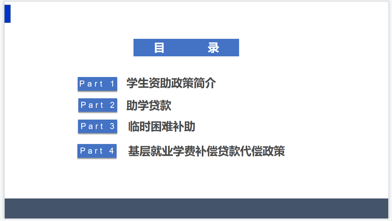 会议主要介绍了四点内容,分别是学生资助政策、助学贷款政策、临时困难补助政策以及基层就业学费补偿贷款代偿政策。郭浪浪详细介绍了研究生架构中的奖助政策内容,说明了“奖”“助”“补”“贷”四个方面的学生资助项目,其中突出强调了各资助项目的申请条件及申请流程。