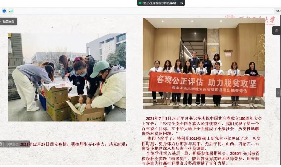两位优秀毕业生党员代表就自身成长故事、感悟感想进行分享。首先,马晓丽同志从踏入西工大的校门,到如今以西工大人的名义走向社会,开启一段新的征程进行了回顾,表明今后会牢记公诚勇毅的校训、发扬三实一新的校风,以更加严格的标准和要求来激励自己,展现西工大人的精神风貌。