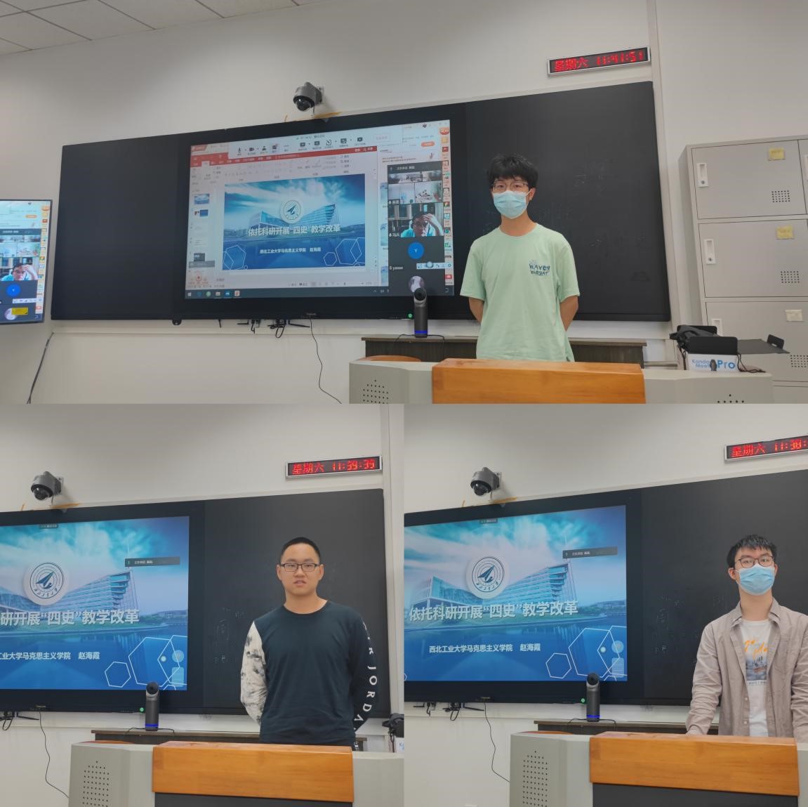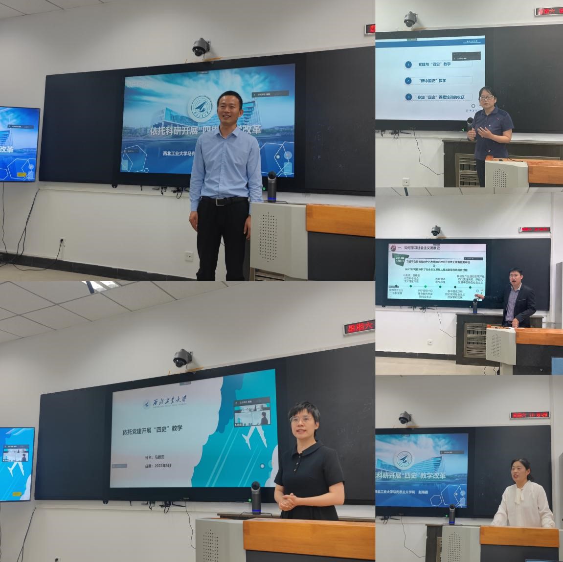 在教研分享环节,《新中国史》课程负责人马新蕊副教授做了依托党建开展“四史”教学的分享,指出以支部建设为契机,推动”四史“教学、科研、社会服务等功能于一体,以习近平总书记大历史观为根本遵循,准确把握新中国史的主线,积极回应学生关注,及时纠偏。《社会主义发展史》课程负责人山磊助理教授做了课程思政与思政课程协同推进“四史”课程建设的分享,认为只有通过全方位引入思政育人要素,使广大本科生在学习专业课程的同时,正确认识社会主义发展的历史主题、历史脉络、历史规律,牢固树立对马克思主义的信仰、对共产主义和社会主义的信念。《中共党史》《改革开放史》课程负责人赵海霞副教授,对“四史系列课程”教学团队依托科研开展课程建设情况,存在的问题及以后的教学工作规划进行分享,认为“四史”系列课程教学离不开教师们对相关内容的研究,教师需坚持历史审视与现实观照相关联,进一步加强四史相关的研究,持续挖掘思想政治理论背后的历史文化底蕴,持续拓展话语边界,切实提升思政课教学的实效性。小说h