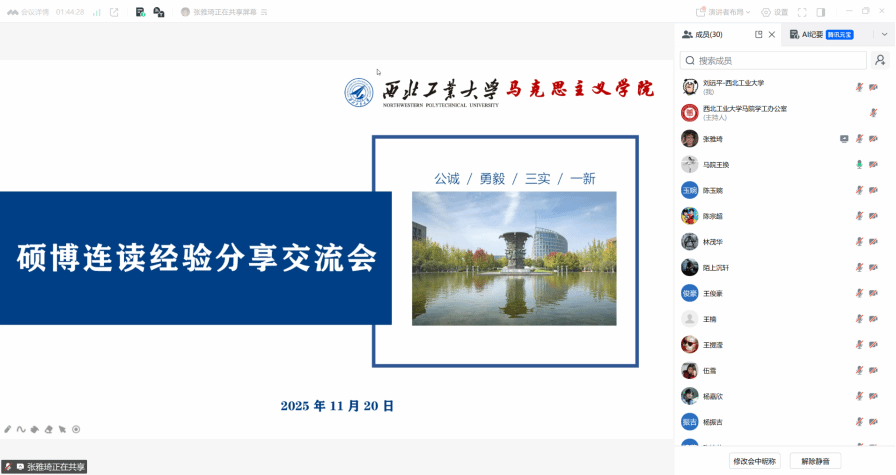 于11月20日举办线上硕博连读经验分享交流会。本次会议以“朋辈引领+政策解读”为主线,通过经验分享、政策剖析为学子们搭建高效互动、共同成长的交流平台,助力学生在学术深造的道路上行稳致远。硕士辅导员王换、研究生培养秘书肖妮及学院学生共同参与,会议由王换主持。