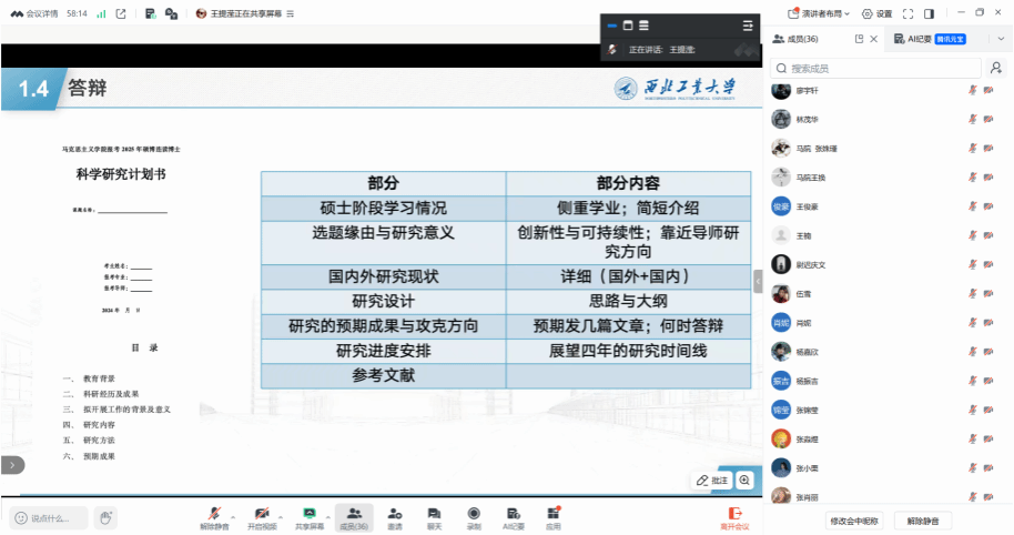 四位同学分享交流后,肖妮就硕博连读的招生政策作了系统解读。她详细介绍了政策核心要点与具体操作规范,清晰梳理申请全流程节点,明确材料准备的关键要素与注意事项,为有申请意向的同学提供实操性指导。随后,王换作总结发言,强调学术严谨与学术诚信在科研道路上的根本性意义,并鼓励同学们树立“静水流深”的发展观,以自觉、自律、自强的信念和持之以恒的平稳心态,积极投入到硕博连读的申请与学术生涯规划之中。