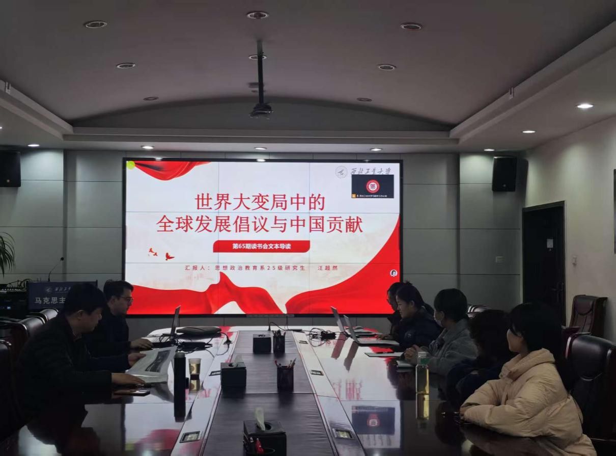 习近平新时代中国特色社会主义思想学习读书小组第六十五期活动以《推动落实全球发展倡议、全球安全倡议、全球文明倡议、全球治理倡议》为主题进行学习研讨。本次读书会由小说h