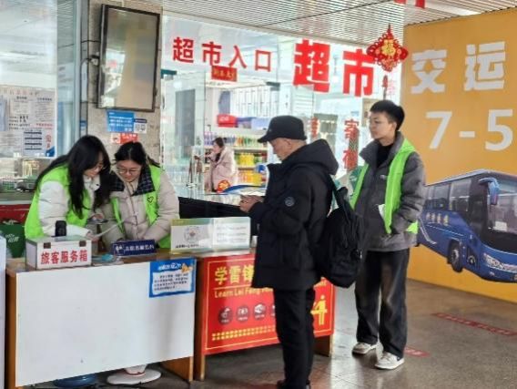 在做好基础服务的同时,志愿者们还通过丰富多样的活动为车站增添温暖年味。实践团队在车站设置“温暖返乡服务点”,为务工人员和返乡旅客送上春联、“福”字和新春慰问礼包,让匆匆归途多了一份节日的温情。与此同时,志愿者们结合春运期间常见的安全问题开展反诈宣传,通过发放宣传资料、现场讲解等方式普及防范知识,提醒旅客提高警惕、守护财产安全。贴心的服务与实用的宣传相结合,让春运旅途更加安全、顺畅,也让志愿服务在细节中传递出浓浓的人文关怀。
