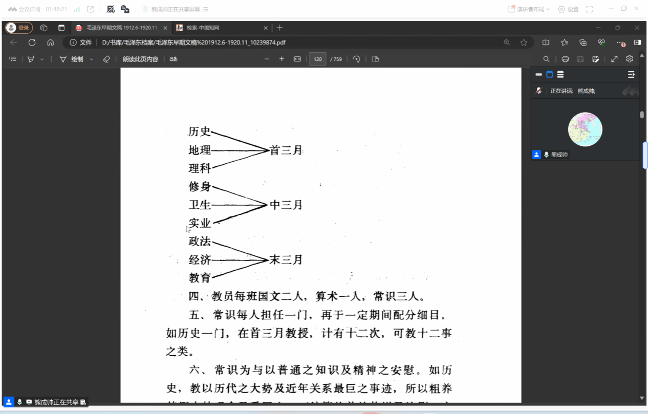 读书会伊始,熊老师和大家讨论了新学期的学习进展和生活情况。随后,熊老师谈到读书会选择阅读《毛泽东早期文稿》的目的,在于理解20世纪初中国青年的思想观念、知识体系以及其青睐社会主义思潮的原因,探讨他们为何积极学习马克思主义并走上革命道路。这一设问为本次研读提供了问题意识。
