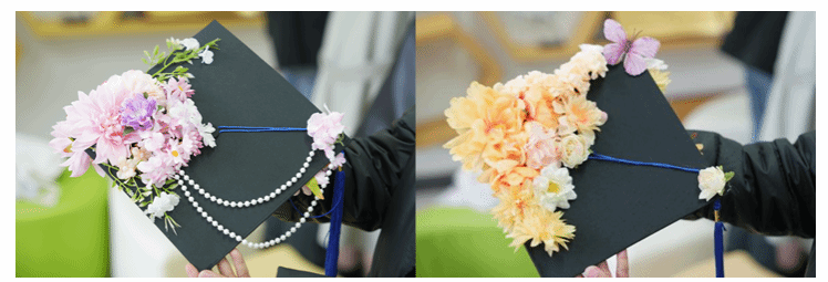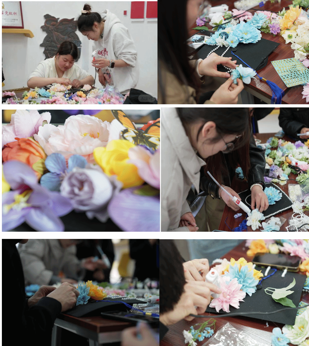 活动现场,学院精心准备了仿真花簇、珍珠串、字母贴、流苏、蕾丝花边等全套DIY材料,品类丰富、色彩多样,为同学们的创意发挥提供了充足保障。大家围坐长桌,或俯身专注用胶枪粘贴花饰,或交流设计思路、相互协作调整布局,指尖流转间,将校园时光与青春心愿融入每一处细节。有的同学以暖橙牡丹与粉紫小花铺陈帽檐,搭配精巧蝴蝶装饰,尽显温婉雅致;有的以浅蓝绣球与珍珠串珠勾勒轮廓,缀以镭射蝴蝶结,兼具优雅与个性;还有的用金色字母贴镌刻专属名字缩写,让学士帽成为独一无二的青春信物。