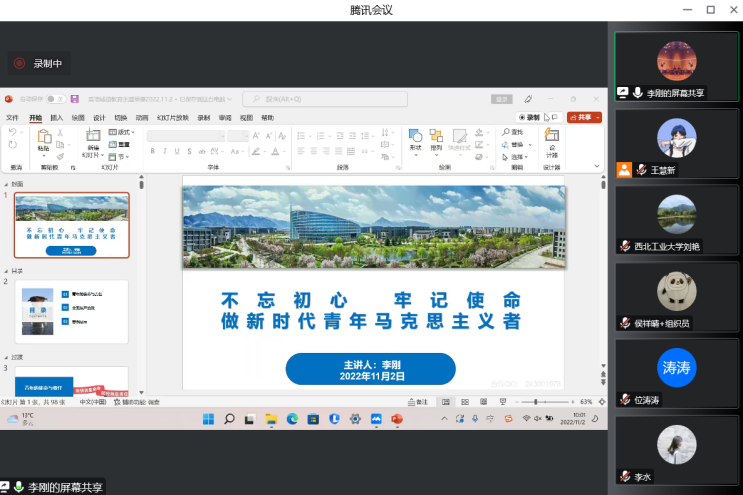 研究生培养目标,指出学院学生党员在疫情防控、党史学习教育、志愿服务中展现出的模范先锋作用,正是彰显了青年马克思主义者的知行合一与责任担当。同时,李刚老师勉励大家,作为马克思主义理论学科的学生要有政治敏锐性和时代责任感,坚定理想信念,夯实理论基础,将个人抱负与时代、社会的发展紧密结合起来,将个人命运与国家、民族的命运紧密结合起来。