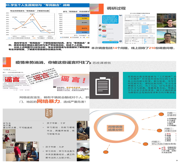 Based on the extensive participation of all students, a total of 16 research teams entered the final assessment after the preliminary assessment, and each of them demonstrated their research results in turn.On the basis of previous researches, many teams have carried out problem extension and new exploration combined with the current epidemic situation, and enriched the research results by closely focusing on the social and public conditions.They thought that it was very necessary and could fully show the significance of labor education in ideological and political course, and highlight the effect of practice education of the teaching reform for ideological and political course.