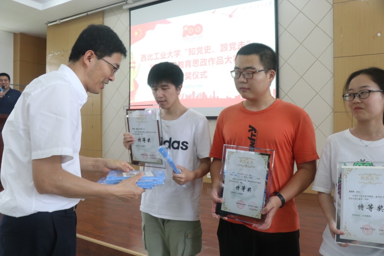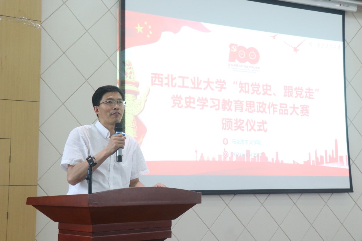 上台发言并总结此次大赛。他鼓励同学们将个人梦想融入时代洪流,在激情奋斗中绽放青春光芒、健康成长进步,做“愿意去、留得住、干得好”的西工大人,秉承“公诚勇毅”校训,弘扬“三实一新”校风,续写新时代的“西工大现象”。通过此次大赛,充分结合思政课堂和第二课堂,深入开展党史、新中国史、改革开放史、社会主义发展史学习教育,让同学们结合党史故事、校园文化、学院特色、校友榜样等内容制作视频,提交思政作品,深化党史学习教育,让红色基因、革命薪火代代传承。
