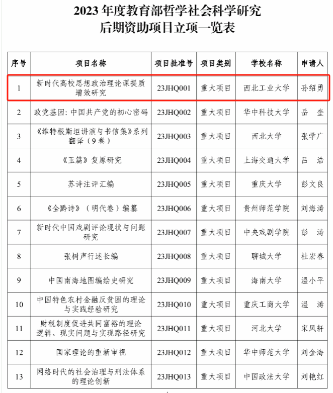 孙绍勇教授申报的《新时代高校思想政治理论课提质增效研究》获批后期资助重大项目。