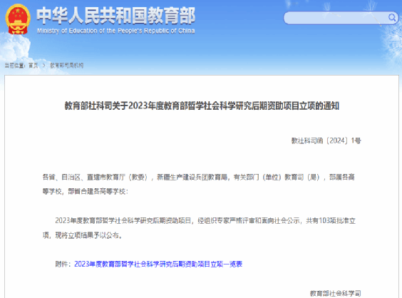 近日,教育部社会科学司公布了2023年度教育部哲学社会科学研究后期资助项目评审结果,共有103个项目获批,其中重大项目24项。小说h