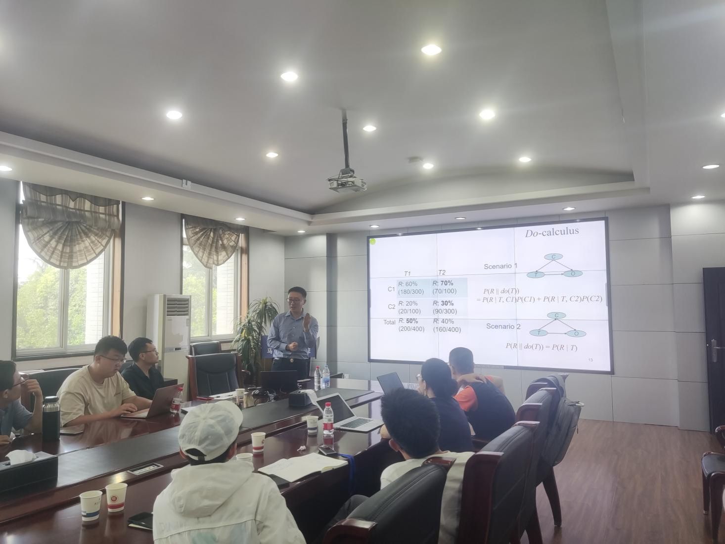 与会学者对张寄冀的报告表示出浓厚的兴趣,并围绕报告内容展开了深入的学术讨论。特别是就因果推理的经典案例辛普森悖论,与会学者纷纷发表了各自的意见:张寄冀认为,条件概率不能独立解决辛普森悖论,必须在条件概率中引入do算子。对此,王雨程提出了一个引入do算子的具体实例。陈千千、马醒初试图以修正案例数据的方式,单纯通过条件概率解决辛普森悖论。但吴小安指出,辛普森悖论的案例数据是事实,这些事实数据并不能随意调整。