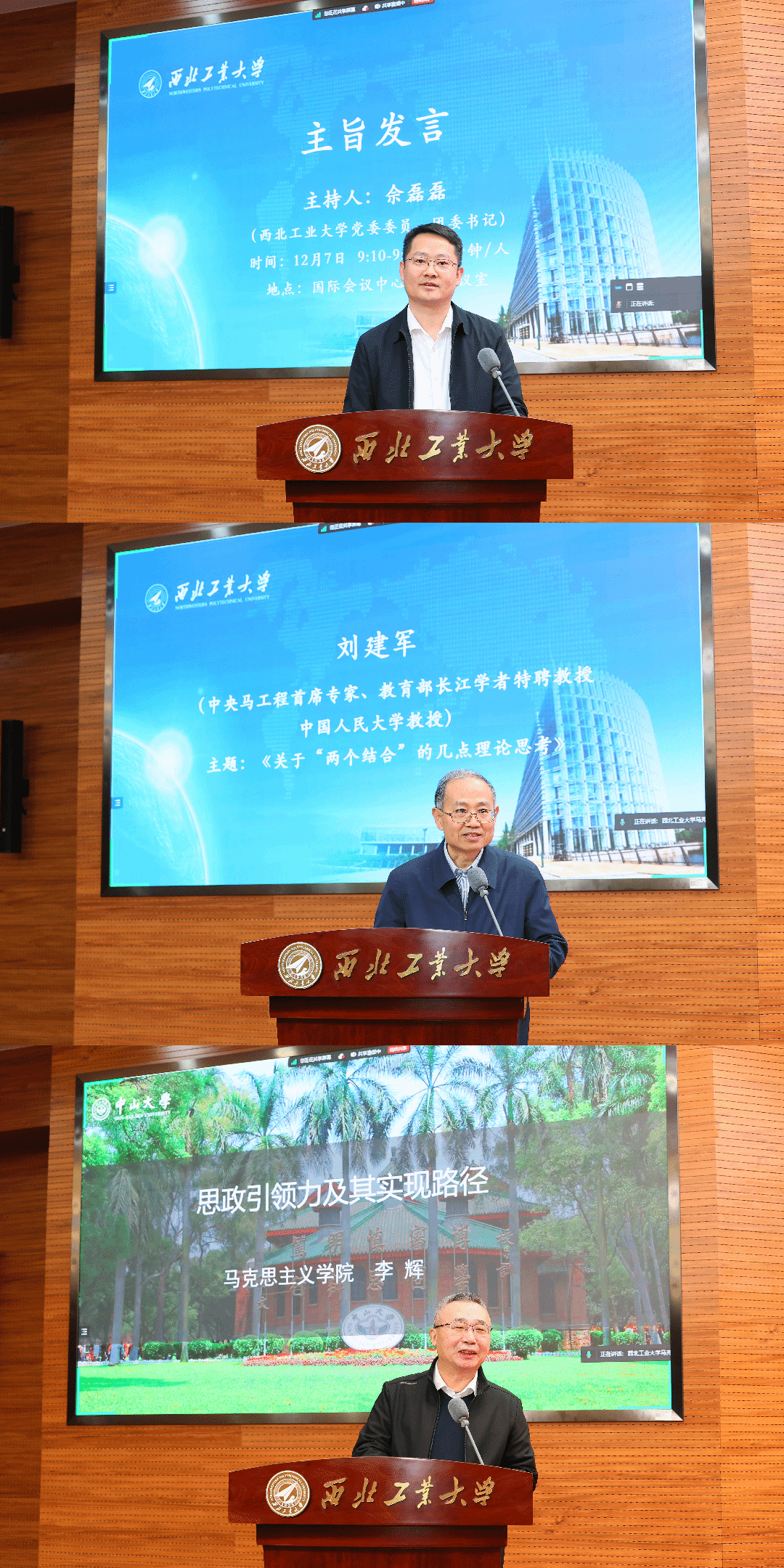 团委书记佘磊磊主持。在主旨发言中,中国人民大学刘建军教授、中山大学李辉教授作了精彩纷呈的发言。中央马克思主义理论研究和建设工程首席专家、国家领军人才、教育部特聘教授刘建军围绕“关于‘两个结合’的几点理论思考”这一主题进行了主旨发言,从定位、层次、又一次思想解放、新的文化生命体四个方面深入浅出的解读了关于“两个结合”的几点思考。国家教学名师,李辉教授作了“思政引领力的可行路径”的主题报告。他从自身经历出发,从思政引领力的内涵、影响思政引领力的因素、思政引领力实现的路径方面进行了深入的探讨。