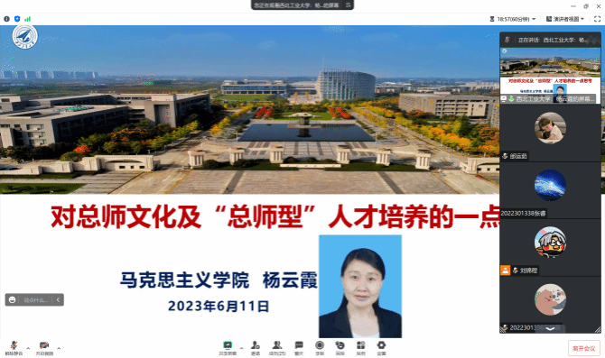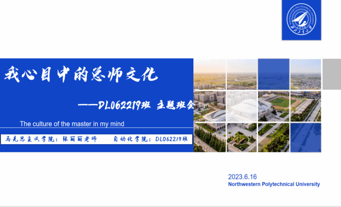 6月13日,思想政治教育系主任宁殿霞老师与04102290班班主任马强老师共同为学生带来“我心中的总师文化”主题班会。宁殿霞老师对“总师文化”的近期研究成果做了详细介绍,并阐述“何谓总师文化”这一关键命题,引发了同学们对探讨“总师文化”的浓厚兴趣。总师文化的关键在于薪火相传,通过此次班会的召开,希望同学们将总师精神与大学生学习生活相结合,为培养新时代西工大人即“总师型人才”添砖加瓦。