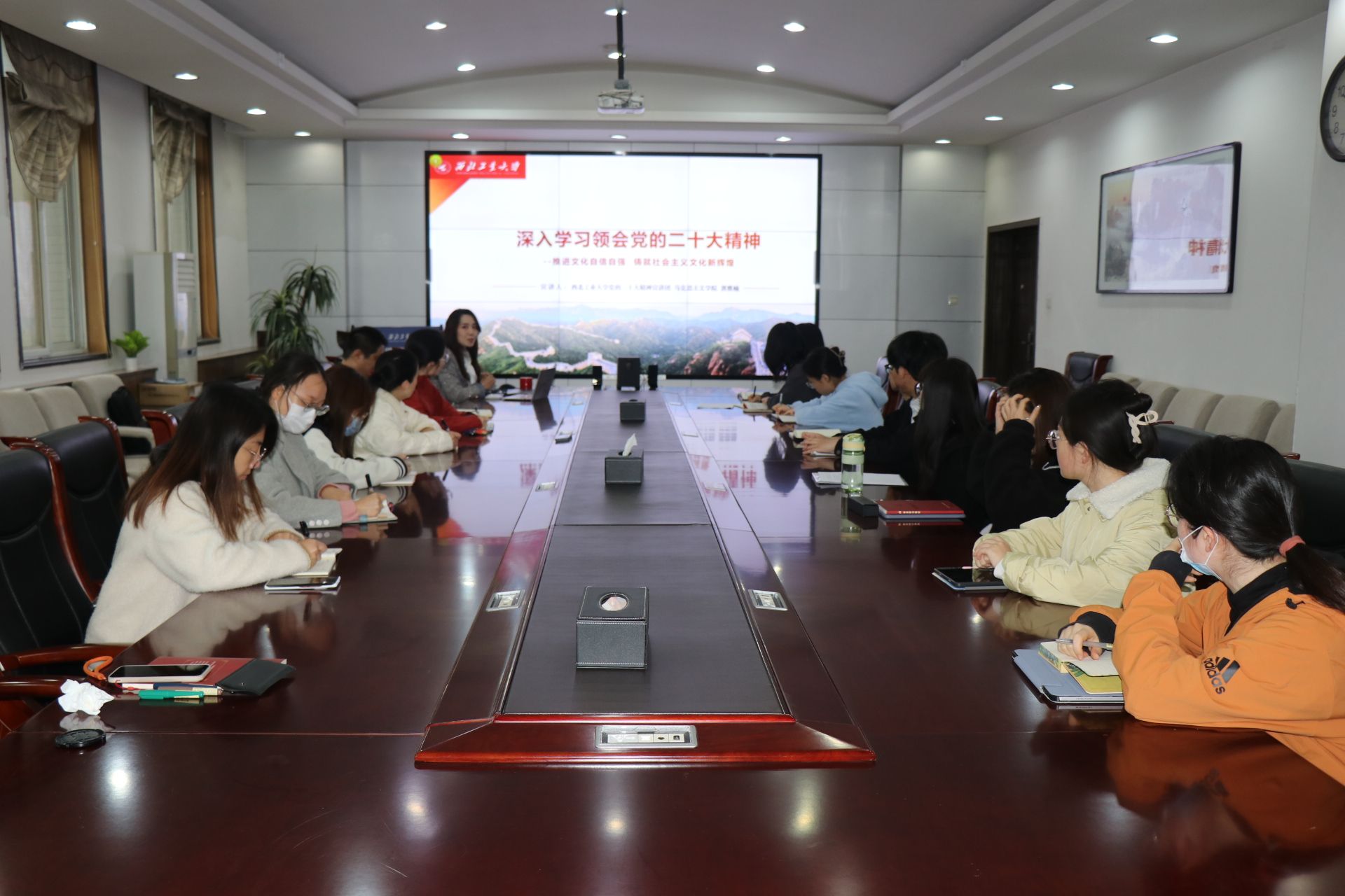 机关党支部和学生党支部联合开展“深入贯彻落实党的二十大精神”主题党日活动。学院办公室主任郭雅楠作为党的二十大精神宣讲团成员为支部师生党员讲授“推进文化自信自强,铸就社会主义文化新辉煌”的主题党课,各支部师生党员积极参加了学习。
