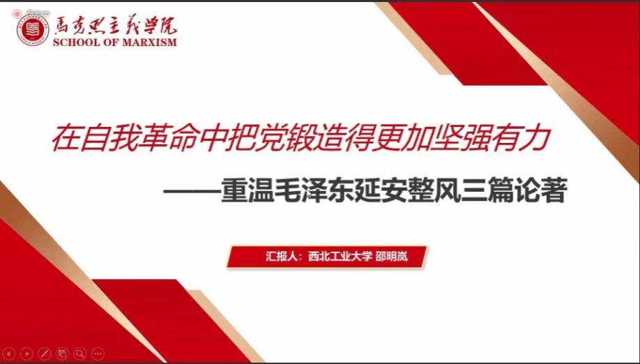 青马先锋学生宣讲团成员邵明岚以《在自我革命中把党锻造得更加坚强有力——重温毛泽东延安整风三篇论著》为题,以延安整风《改造我们的学习》《整顿党的作风》《反对党八股》三篇经典论著为切口梳理了毛泽东对党的自我革命的顶层设计,展示了全面建设社会主义现代化新征程中中国共产党人自我革命的深远意义,同时强调新时代青年要从党的百年奋斗历史中深刻领会党的自我革命的政治品格,以提升本领、推动学习、指导工作。