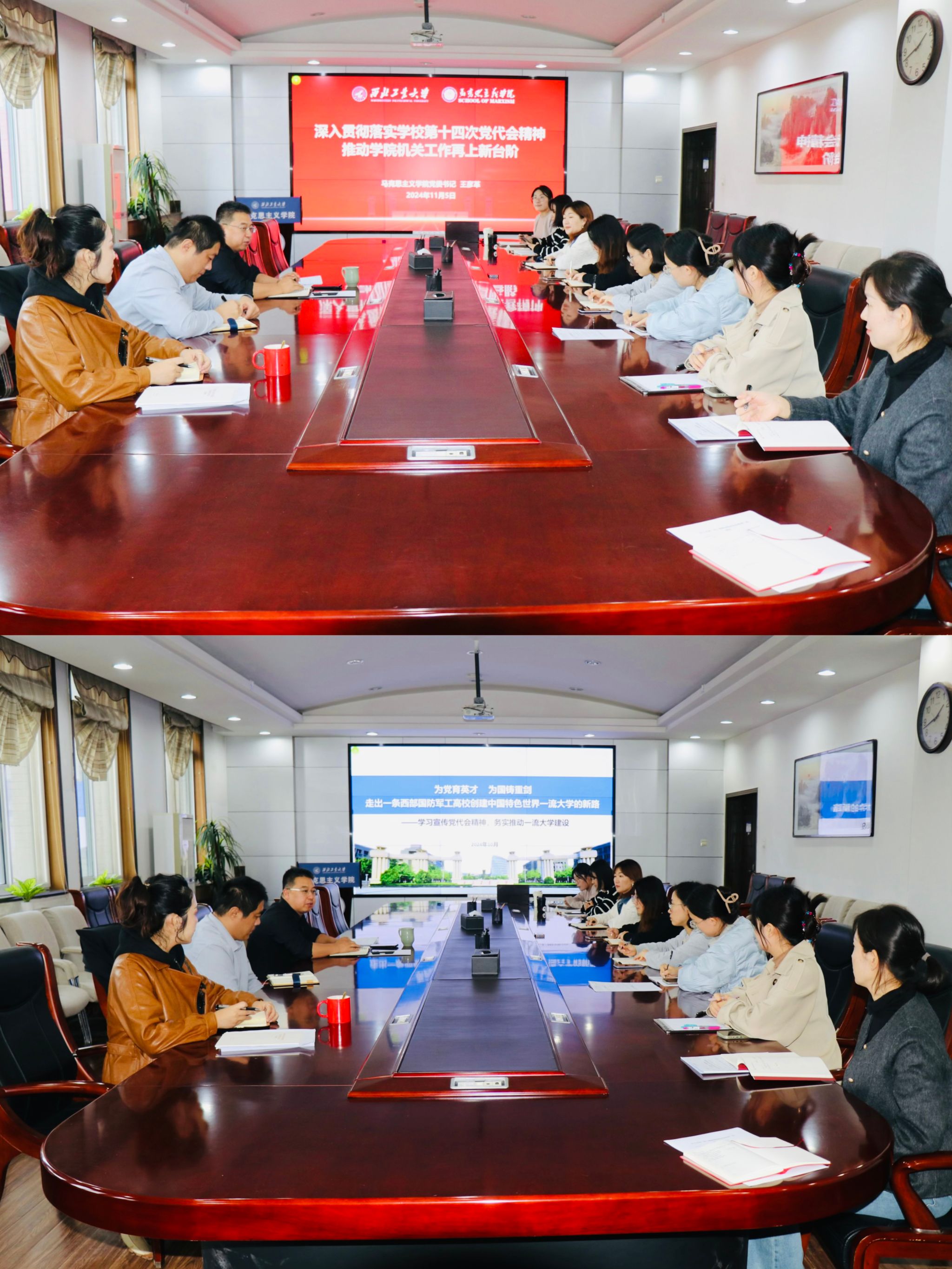 会上,王彦革同志结合大量的案例和详实的数据,生动形象地展示了学校及学院近年来在人才培养、科学研究、师资队伍等方面取得的显著成就和美好的未来,并就学院如何落实学校第十四次党代会精神进行了深入详细的宣讲。随后,王彦革同志就如何做好机关工作从沟通、积累、总结三个方面分享工作经验。