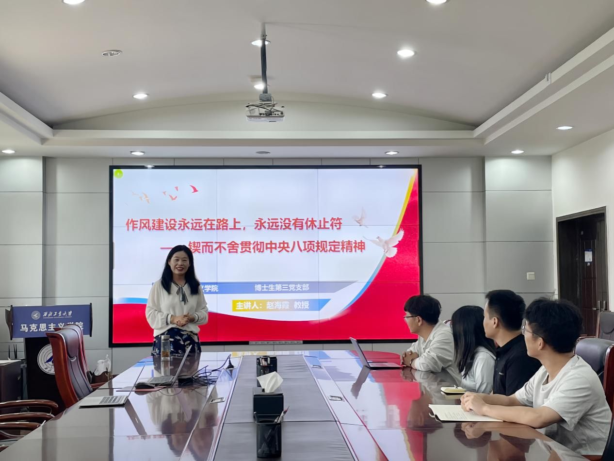 在谈到如何深入贯彻中央八项规定精神时,赵海霞教授结合工作实际,为党员们提供了切实可行的建议。她强调,全体党员要提高政治站位,增强“四个意识”、坚定“四个自信”、做到“两个维护”,将中央八项规定精神内化于心、外化于行。要不断增强以自我革命精神,推动作风建设的政治自觉,一以贯之、守正创新,驰而不息正风肃纪,将作风建设引向深入,为以中国式现代化全面推进强国建设,民族复兴历史伟业提供坚强保障。