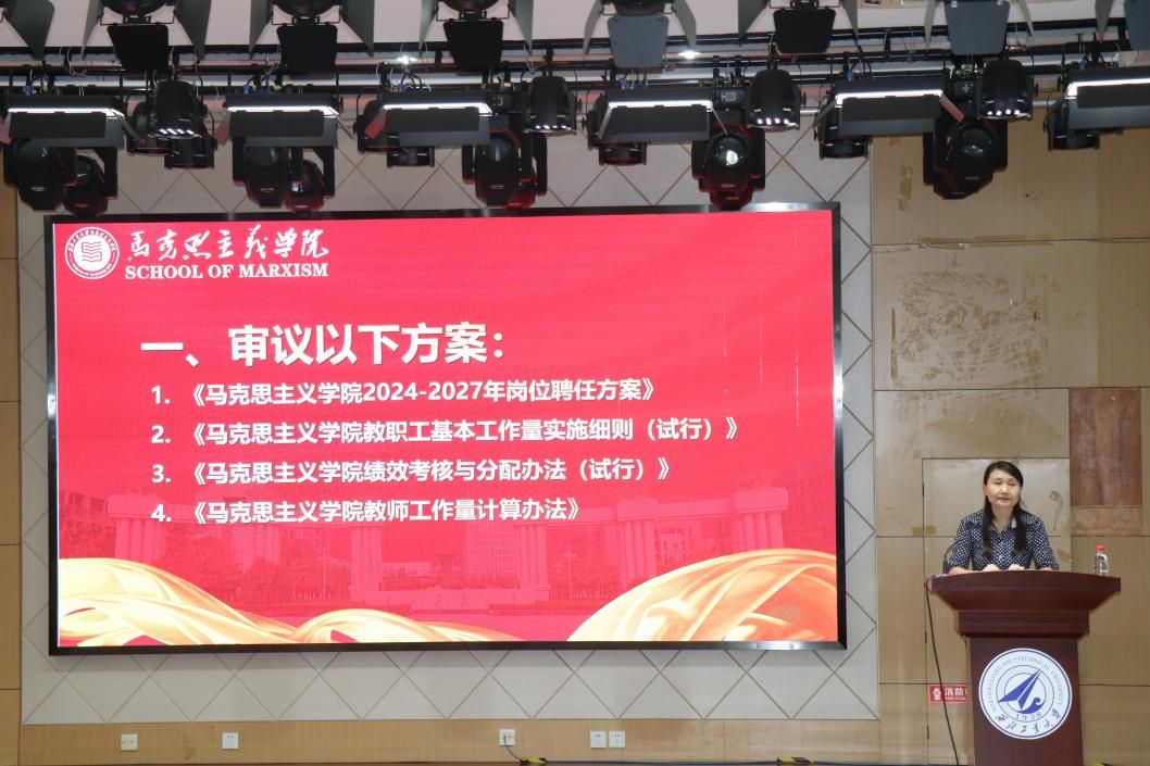 首先,院长杨云霞介绍2024-2027年学院岗位聘任方案。随后组织全体参会教职工,共同审议通过《小说h