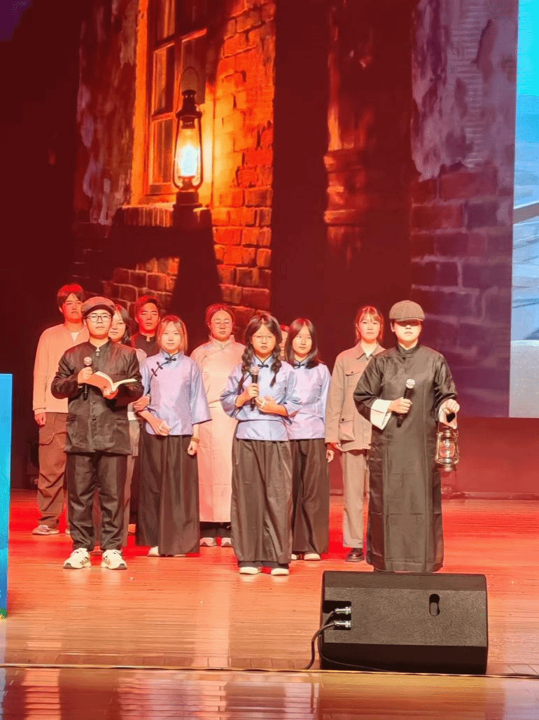班级的展演节目匠心独运,以“情景剧+合唱”的融合形式深情呈现。当1938年古路坝的麻油灯火遇上2025年西工大图书馆的灯光,一段跨越近百年的星火传承故事徐徐展开。舞台之上,时空交错:一侧是烽火岁月里,西北工学院学子们在简陋学舍中抱书苦读,以“读好书救中国”的信念坚守初心;另一侧是新时代校园中,小说h