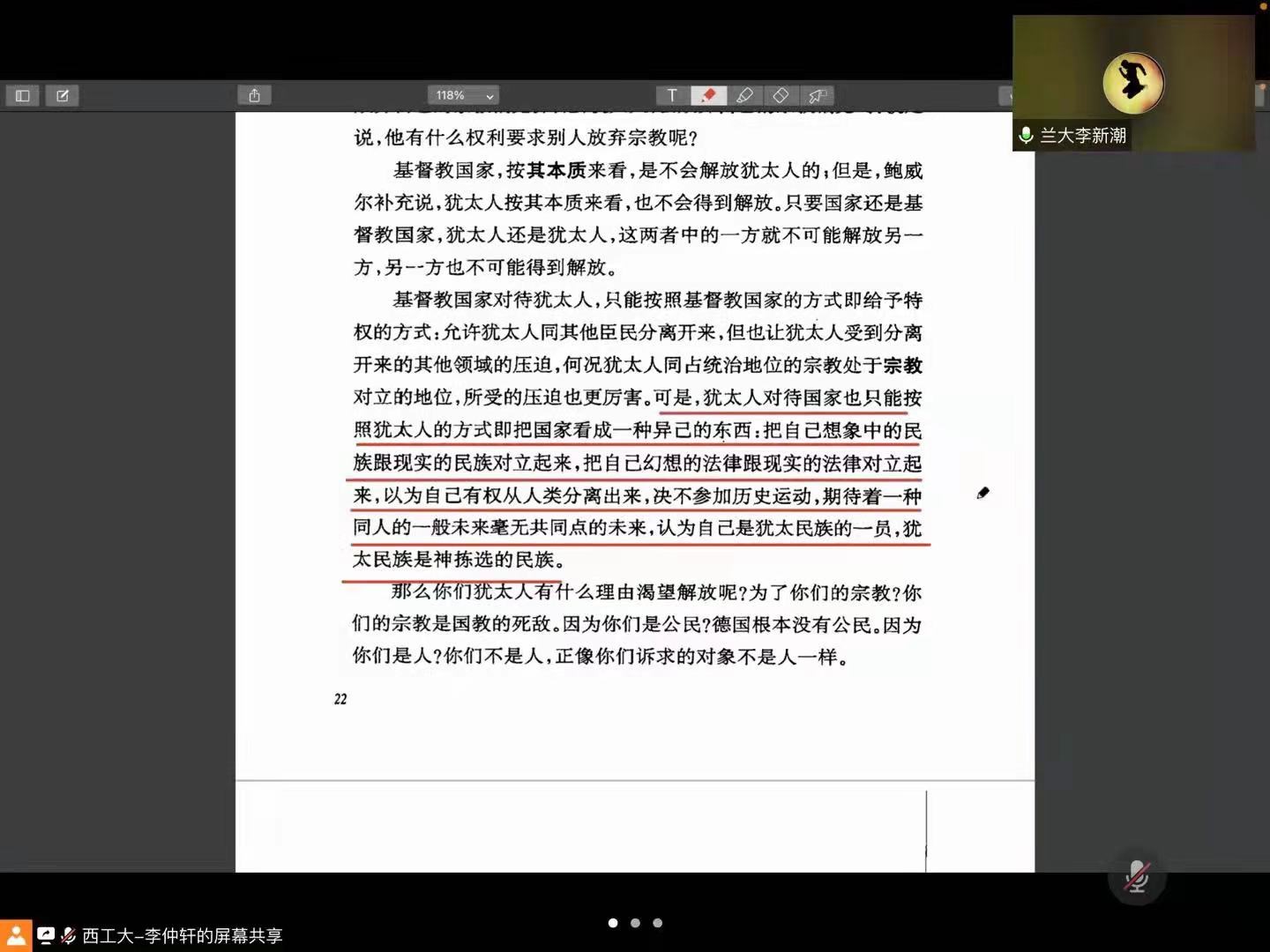 硕士生连翊君谈到,马克思首先从两个方面入手,分析了鲍威尔提出问题的方式。第一,犹太人从自私自利的立场出发,要求政治解放:鲍威尔认为,德国的犹太人渴望政治解放。但德国人包括非犹太人都没有政治自由。因此如果德国犹太人真的要求政治解放,那就应该是要求全部德国人的政治解放,甚至全人类的解放,而不应该是仅仅要求犹太人的政治解放。压迫和耻辱普遍存在,不能只顾自己的解放。犹太人只顾自己,注定达不到目的。第二,德国犹太人要求同其他德国人享有平等的权利:鲍威尔认为,如果每个民族都是自私的,那就无所谓平等,因为每个人都坚持自己民族的特权。普遍自私必然带来普遍压迫、普遍奴役。李新潮老师对于“犹太人对待国家也只能按照犹太人的方式即把看成一种异己的东西......”这一部分进行了答疑解惑。