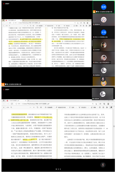 黄奕采、王芳、李红梅、时璐瑶、李瑞晨、李仲轩等同学先后阅读文本内容,表达了对所阅读内容的理解,并提出了一些针对性的问题。师生们围绕恩格斯在马克思主义发展中的贡献和地位、马克思和恩格斯相互影响等问题进行讨论和交流,老师们对西斯蒙第、巴枯宁、魏特林和蒲鲁东等人思想的主要内容及马克思对他们的批判等进行了详细的补充。