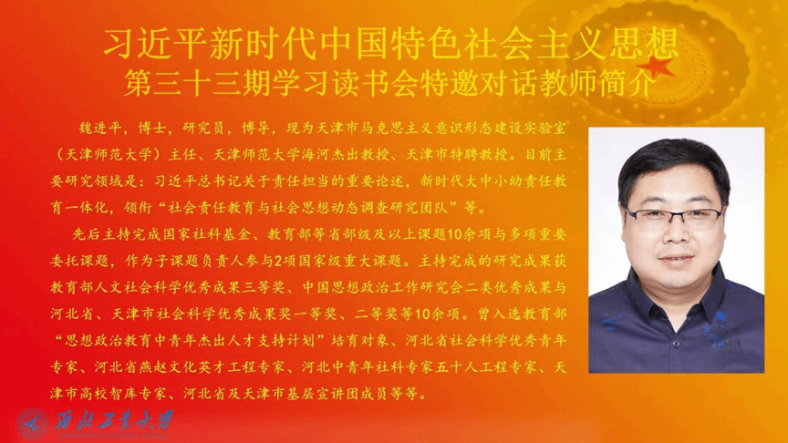 专家简介:魏进平,博士,研究员,博导,现为天津市马克思主义意识形态建设实验室(天津师范大学)主任、天津师范大学海河杰出教授、天津市特聘教授。目前主要研究领域是:习近平总书记关于责任担当的重要论述,新时代大中小幼责任教育一体化,领衔“社会责任教育与社会思想动态调查研究团队”等。先后主持完成国家社科基金、教育部等省部级及以上课题10余项与多项重要委托课题,作为子课题负责人参与2项国家级重大课题。主持完成的研究成果获教育部人文社会科学优秀成果三等奖、中国思想政治工作研究会二类优秀成果与河北省、天津市社会科学优秀成果奖一等奖、二等奖等10余项。曾入选教育部“思想政治教育中青年杰出人才支持计划”培育对象、河北省社会科学优秀青年专家、河北省燕赵文化英才工程专家、河北中青年社科专家五十人工程专家、天津市高校智库专家、河北省及天津市基层宣讲团成员等。