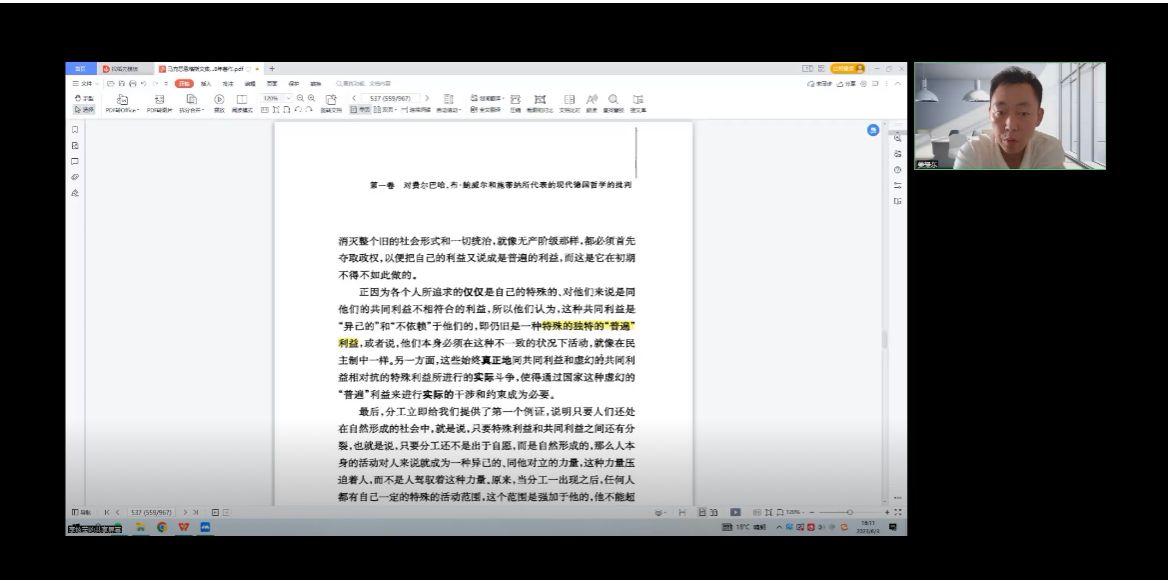 第43期“启真明智”读书会通过腾讯会议顺利举行。本次读书会由学院齐承水老师主持,东北大学姜耀东老师、温州大学张海波老师与硕博同学们一起阅读了《德意志意识形态》。