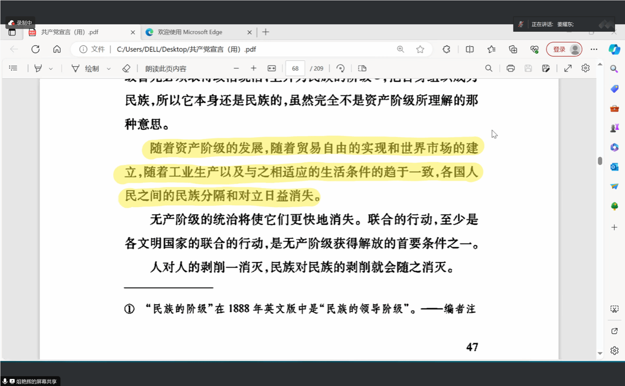 读书会由第一位同学俎艳辉讲解《共产党宣言》第二章。她指出马克思在《共产党宣言》中所说共产党不是要剥夺人们占有社会产品的权利,而是只剥夺利用占有去奴役他们劳动的权利。她还详细讲解了资本主义社会对于共产主义的污蔑以及马克思的反击。最后她提出了疑问:《共产党宣言》中讲到随着资产阶级的发展,贸易自由的实现和世界市场的建立,各国人民之间的民族风格和对立日益消失。但是反观现今发展形势,出现了俄乌冲突、巴以冲突等,仿佛是日益加剧的,我们怎么更好的理解这一现象?这个问题首先由赵光辉老师进行解答,他认为马克思所说的共产主义在当今社会还没有实现,国家与国家之间的差距仍旧很大,距离那种较为和谐的世界还存在距离。姜耀东老师也表示,阅读《共产党宣言》,首先要了解创作的背景,它是对全世界无产阶级的一个革命性的纲领,资本主义正是突破了封建主义才具有极强的生命力。而现今随着资本主义的统治力量的下降,再到社会主义力量的上升,所以我们要联系变化发展的来看问题。