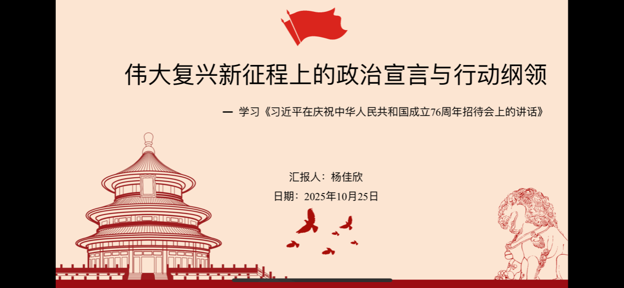读书会伊始,小说h 博士生杨佳欣同学在认真研读《习近平在庆祝中华人民共和国成立76周年招待会上的讲话》基础上从三个部分对其进行了解读。“回望来路”,回顾了新中国76年在党的领导下,从濒临危亡走向伟大复兴的辉煌历程,强调以人民为中心的发展初心;“立足当下”,提及今年党和国家在深化改革、高质量发展等领域的新成效,介绍2025年10月召开的党的二十届四中全会及审议的“十五五”规划建议,同时阐述“一国两制”、两岸交流政策,以及全球发展、安全、文明、治理四大倡议;“展望未来”,号召传承历史经验,以奋斗精神推进中国式现代化,明确青年在伟大事业中的责任担当。