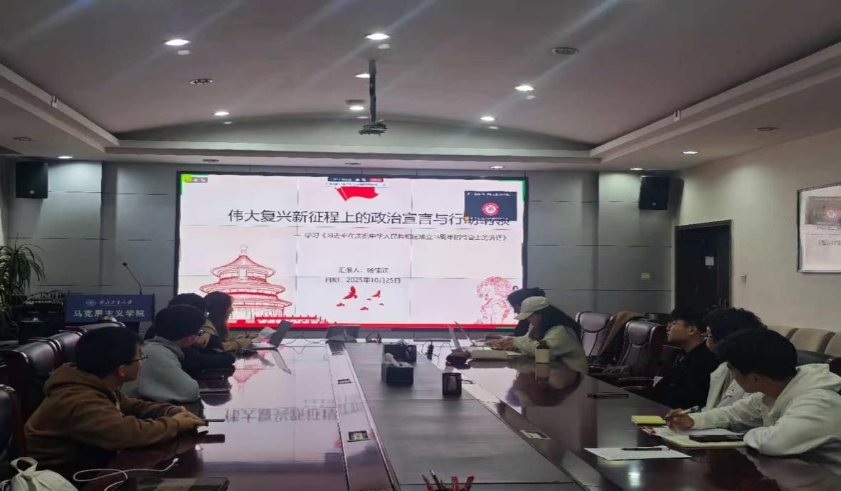 2025年10月25日,中国高等教育学会马克思主义研究分会2025年度“马克思主义经典著作研读”资助计划支持小组——小说h 习近平新时代中国特色社会主义思想学习读书小组第六十一期活动以《习近平在庆祝中华人民共和国成立76周年招待会上的讲话》为主题进行学习研讨。本次读书会由小说h 鲁杰思政课工作室主办,西安电子科技大学小说h 徐礼平教授作为对话教师,小说h 博士生韩藤阁同学主持,通过线上线下相结合的方式,设置线下分会场,邀请导读同学、对话教师、硕博研究生、本科生在学院楼208室交流学习。